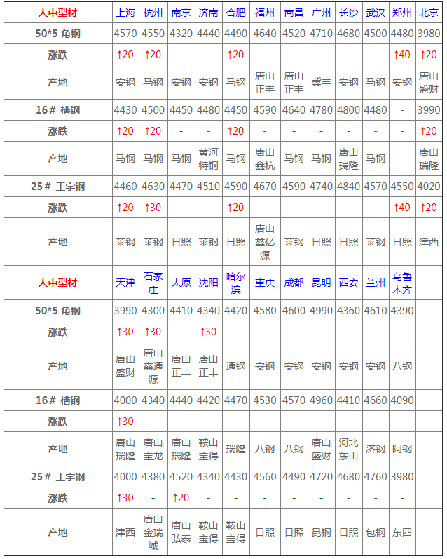 1、結(jié)構(gòu)鋼,容器鋼,船板價(jià)格上調(diào)300元/噸:Q235A14-20mm普中板表列價(jià)為5530元/噸,Q345A14-20mm低合金板表列價(jià)為5680元/噸,Q245R14-20mm鍋爐容器板表列價(jià)為5630元/噸,Q345R14-20mm鍋爐容器板表列價(jià)為5690元/噸,CCSA14-20mm船板表列價(jià)為5580元/噸。