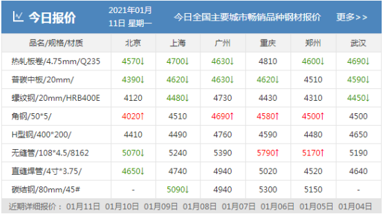 據(jù)數(shù)據(jù)監(jiān)測,今日共28家鋼廠調(diào)價,其中漲幅最高為弘泰工字鋼,調(diào)價幅度110元/噸,跌幅最大為江蘇雨花建材,調(diào)價幅度90元/噸,具體調(diào)價明細如下: 鋼廠調(diào)價 武安裕華高線價格平穩(wěn) 山西高義建材價格平穩(wěn) 河鋼北京建材價格平穩(wěn) 河鋼天津建材價格平穩(wěn) 唐山玄龍螺紋鋼價格平穩(wěn) 沙鋼1月中旬螺紋鋼上調(diào)50元/噸 長江鋼鐵建材下調(diào)60元/噸 福建三寶建材下調(diào)50元/噸 江蘇雨花建材下調(diào)90元/噸 石橫特鋼建材下調(diào)30元/噸 萊鋼永鋒建材下調(diào)30元/噸 山東西王建材下調(diào)30元/噸 江蘇鴻泰螺紋鋼下調(diào)50元/噸 電力角鋼上調(diào)40元/噸 鑫杭槽鋼上調(diào)30元/噸 唐城工字鋼上調(diào)90元/噸 大成工字鋼上調(diào)70元/噸 宏潤H型鋼上調(diào)60元/噸 電力槽鋼上調(diào)40-60元/噸 弘泰工字鋼上調(diào)110元/噸 東方鋼廠槽鋼上調(diào)60元/噸 鑫億源H型鋼上調(diào)40元/噸 山東傳洋型材上調(diào)40元/噸 敬業(yè)中厚板下調(diào)40元/噸 普陽中厚板下調(diào)30元/噸 淮鋼優(yōu)鋼價格平穩(wěn) 沙鋼1月中旬工業(yè)線材平穩(wěn) 沙鋼永興碳結(jié)鋼上調(diào)50元/噸 鋼廠調(diào)價占比 上調(diào)12家,占比42.9%,調(diào)價幅度30-110元/噸。 下調(diào)9家,占比32.1%,調(diào)價幅度30-90元/噸。 平穩(wěn)7家,占比25%。 重要行業(yè)信息 一、12月中國CPI同比增長0.2% PPI同比下降0.4% 中國12月居民消費價格(CPI)同比增長0.2%,預期為0%,前值下降0.5%。2020年CPI同比漲2.5%,預期漲2.5%,前值漲2.9%。中國12月工業(yè)生產(chǎn)者出廠價格(PPI)同比下降0.4%,預期下降0.7%,前值下降1.5%。2020年全年,工業(yè)生產(chǎn)者出廠價格比上年下降1.8%。 二、江蘇省綠色工廠名單(第一批) 近日,江蘇省工信廳發(fā)布了關于公布江蘇省綠色工廠名單(第一批)的通知,其中中新鋼鐵集團有限公司、江蘇常寶普萊森鋼管有限公司、常熟市龍騰特種鋼有限公司、連云港興鑫鋼鐵有限公司、連云港亞新鋼鐵有限公司、江蘇利淮鋼鐵有限公司、揚州恒潤海洋重工有限公司7家鋼企入選。 三、12月重卡銷11.4萬輛再創(chuàng)紀錄 2020年定格162萬輛 2020年12月份,我國重卡市場預計銷售各類車型約11.4萬輛,環(huán)比下降16%,同比增長24%。該銷售數(shù)據(jù)創(chuàng)重卡行業(yè)12月份銷量的新高,比上一個歷史紀錄——2019年12月(9.22萬輛)多出了2.2萬輛左右;這是重卡行業(yè)自2020年以來第十次刷新歷史紀錄。 四、12月挖掘機銷量同比增長56.4% 1月9日,根據(jù)中國工程機械工業(yè)協(xié)會挖掘機械分會行業(yè)統(tǒng)計數(shù)據(jù),2020年12月,共計銷售各類挖掘機械產(chǎn)品31530臺,同比漲幅56.4%。國內(nèi)市場銷量27319臺,同比漲幅58.5%。出口銷量4211臺,同比漲幅44.4%。 五、滬豫鄂晉掀起重大項目開工潮 2020年剛開始,各地掀起重大項目開工潮,上海、河南、湖北、山西等多地集中開工一批重大項目,相關投資規(guī)模均在千億元級別。目前陜西、廣西、江西、湖北等地均已發(fā)布今年重大項目投資計劃,多地計劃投資規(guī)模均在兩三萬億元。