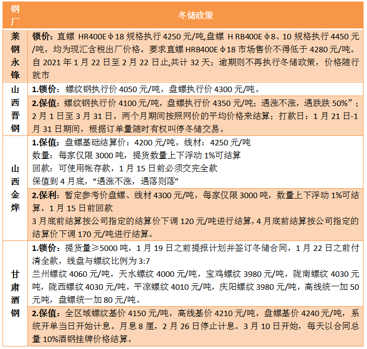 目前河鋼集團對焦炭采購價上調100元/噸,且山東主流鋼廠也對焦炭采購價格上調100,漲后執行山東省內2690元/噸,省外2700元/噸;準一級(干熄)冶金焦:漲后執行2760元/噸,不分省內外。焦炭供需缺口仍在,節前仍處于易漲難跌的階段,對成材價格形成支撐,因此,鋼廠冬儲整體讓利空間有限,年前鋼價下跌的空間也相對有限。