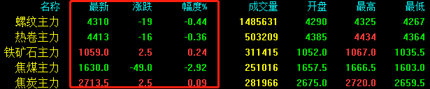 期鋼小幅收跌,期螺下跌19收報4310,期卷下跌16收報4413,鐵礦石漲2.5收報1059,焦煤下跌49收報1630,焦炭上漲2.5收報2713.5。