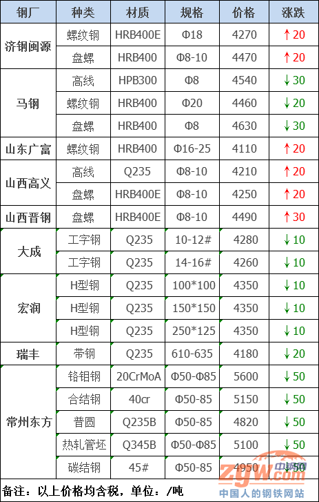 據(jù)數(shù)據(jù)監(jiān)測,今日共29家鋼廠調(diào)價,其中漲幅最高為山西晉鋼盤螺,調(diào)價幅度30元/噸,跌幅最大為常州東方優(yōu)鋼,調(diào)價幅度50元/噸,具體調(diào)價明細(xì)如下: 鋼廠調(diào)價 石橫特鋼建材價格平穩(wěn) 萊鋼永鋒建材價格平穩(wěn) 河鋼北京建材價格平穩(wěn) 河鋼天津建材價格平穩(wěn) 山西美錦建材價格平穩(wěn) 江蘇雨花建材價格平穩(wěn) 山東西王建材價格平穩(wěn) 江蘇鴻泰螺紋鋼價格平穩(wěn) 沙鋼1月下旬建材價格平穩(wěn) 山西晉鋼建材上調(diào)30元/噸 濟鋼閩源建材上調(diào)20元/噸 山東廣富建材上調(diào)20元/噸 山西高義建材上調(diào)20元/噸 馬鋼建材下調(diào)20-30元/噸 鑫杭槽鋼價格平穩(wěn) 電力型材價格平穩(wěn) 唐城工字鋼價格平穩(wěn) 弘泰工字鋼價格平穩(wěn) 山東傳洋型材價格平穩(wěn) 鑫億源H型鋼價格平穩(wěn) 東方鋼廠槽鋼價格平穩(wěn) 大成工字鋼下調(diào)10元/噸 宏潤H型鋼下調(diào)10元/噸 敬業(yè)中厚板價格平穩(wěn) 瑞豐帶鋼下調(diào)20元/噸 淮鋼優(yōu)鋼價格平穩(wěn) 沙鋼工業(yè)線材價格平穩(wěn) 沙鋼永興碳結(jié)鋼價格平穩(wěn) 常州東方優(yōu)鋼下調(diào)50元/噸 鋼廠調(diào)價占比 上調(diào)4家,占比13.8%,調(diào)價幅度20-30元/噸。 下調(diào)4家,占比13.8%,調(diào)價幅度10-50元/噸。 平穩(wěn)21家,占比72.4%。 鋼廠檢修信息 成都成實(512廠)2021年1月停產(chǎn)信息 成都成實鋼廠大邑基地計劃2021年1月25日-31日陸續(xù)停產(chǎn)放假,停產(chǎn)時間一個月,減少建筑鋼材產(chǎn)量16.8萬噸左右。 重要行業(yè)信息 1、中鋼協(xié)擬成立低碳工作推進委員會 中國鋼鐵工業(yè)協(xié)會消息,擬組織成立“中國鋼鐵工業(yè)協(xié)會低碳工作推進委員會”,集合各方優(yōu)勢力量,共同為鋼鐵行業(yè)碳減排目標(biāo)的實現(xiàn),為鋼鐵企業(yè)碳競爭環(huán)境下爭取有利先機發(fā)揮應(yīng)有的作用。委員會下設(shè)三個工作組和一個專家組,其中,低碳發(fā)展工作組負(fù)責(zé)鋼鐵行業(yè)低碳相關(guān)政策、問題調(diào)查和研究,提出政策建議和措施等。 2、中鋼協(xié):2020年12月份國內(nèi)外市場鋼材價格大幅上升 數(shù)據(jù)顯示,2020年12月份,國內(nèi)外市場鋼材價格繼續(xù)走升,且環(huán)比升幅較上月又有所加大。受疫情形勢仍較嚴(yán)峻,以及天氣轉(zhuǎn)冷、臨近春節(jié)等因素影響,后期鋼材需求強度會有所下降,鋼材價格將呈現(xiàn)回落走勢。 3、2020年我國生產(chǎn)原煤38.4億噸 據(jù)國家統(tǒng)計局,2020年12月份全國生產(chǎn)原煤3.5億噸,同比增長3.2%,增速比上月加快1.7個百分點;日產(chǎn)1135萬噸,環(huán)比減少23萬噸。2020年全國生產(chǎn)原煤38.4億噸,比上年增長0.9%。 4、必和必拓公布2021上半財年運營公報 2021財年,截至2020年底的上半財年,以銅產(chǎn)量折算的集團產(chǎn)量基本持平。2021財年,必和必拓石油和煉焦煤的產(chǎn)量指導(dǎo)目標(biāo)保持不變,鐵礦石產(chǎn)量指導(dǎo)目標(biāo)受益于Samarco礦區(qū)于2020年12月開始的生產(chǎn)重啟上調(diào)至2.45億-2.55億噸之間,銅產(chǎn)量指導(dǎo)目標(biāo)區(qū)間受益于埃斯康迪達(dá)銅礦的強勁生產(chǎn)勢頭進一步收窄至151萬至164.5萬噸之間。 5、印度四大鋼廠四季度鋼材產(chǎn)量同比增加6% 據(jù)外媒報道,印度四大鋼鐵生產(chǎn)商JSW、JSPL、TATA和SAIL四季度鋼鐵總產(chǎn)量1495萬噸,同比增長6%。具體來看,四家鋼鐵公司中TATA鋼鐵四季度鋼鐵產(chǎn)量最高,為460萬噸,同比增長3%;SAIL其次,產(chǎn)量為437萬,同比增9%;JSW和JSPL鋼鐵產(chǎn)量分別為408萬、190萬,分別同比增2%、18%。