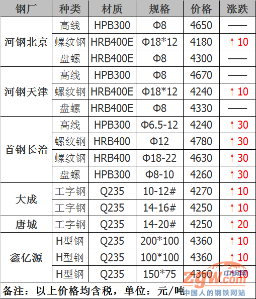 河鋼天津螺紋鋼上調(diào)10元/噸