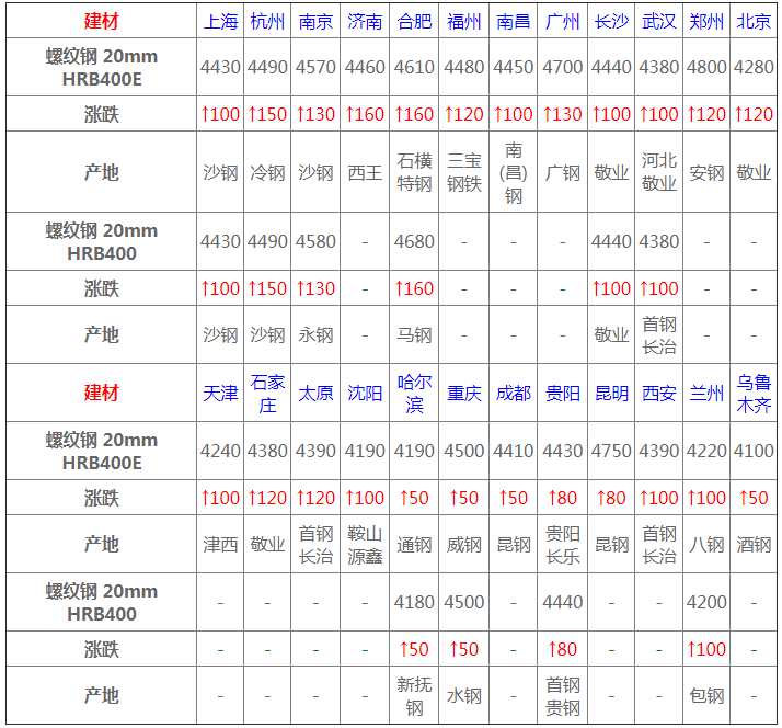 今日建材大漲100-160元/噸,受今日期貨及唐山鋼坯價格大幅拉漲影響,另外也有開門紅的傳統影響,商戶報價明顯上漲。今日市場價格混亂,成交寥寥。