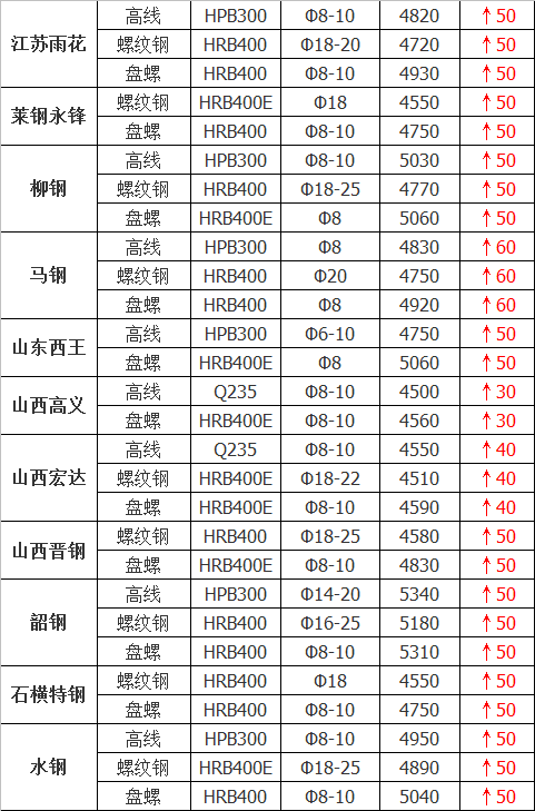 據數據監測,今日共35家鋼廠調價,其中漲幅最高為呈鋼貴陽建材,調價幅度100元/噸,跌幅最大為弘泰工字鋼,調價幅度50元/噸,具體調價明細如下: