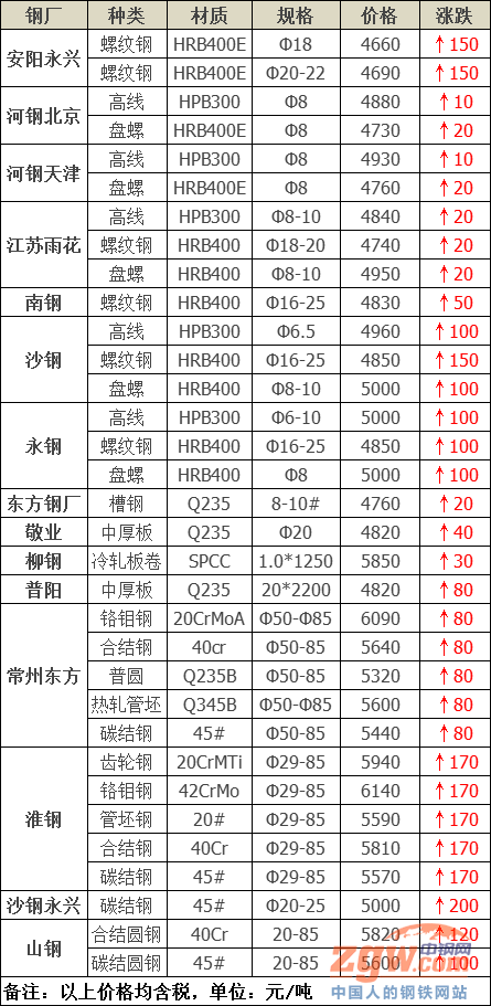 今日據統計的40家鋼廠調價,漲幅最高為包鋼普中板,調價幅度310元/噸,具體調價明細如下:
