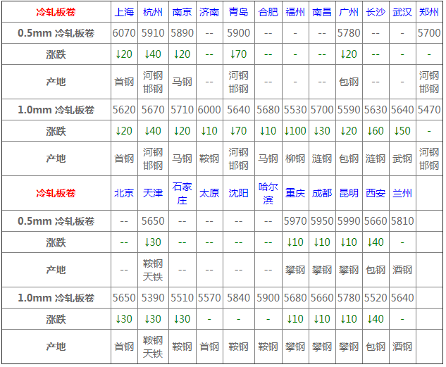 今全國冷軋市場持續下調,幅度在20-70元,市場成交整體表現不佳,下游拿貨積極性不高,商家心態轉弱,以走貨為主;