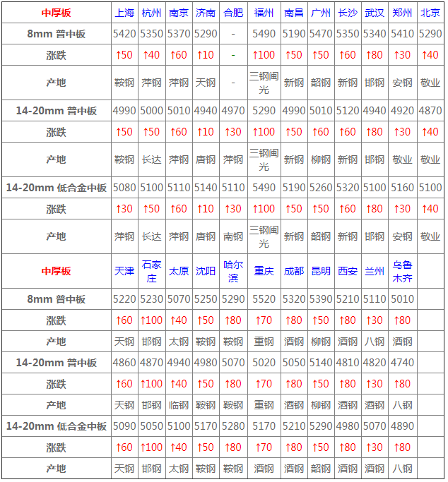 今全國中板主流上行,幅度10-170元/噸,但成交普遍吃力,敏感市場高位盤中陸續回降促出貨,商家心態謹慎觀望;預計中板價格接下來高位運行。