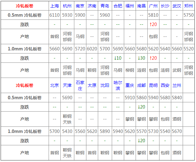 今全國(guó)冷軋主流市價(jià)漲跌穩(wěn)均現(xiàn),幅度10-50,期貨震蕩上行,提振現(xiàn)貨市場(chǎng),下游對(duì)拉高存抵觸心理,多數(shù)商戶(hù)仍以低價(jià)走貨為主;