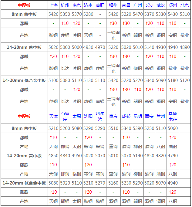 今全國(guó)中板市場(chǎng)穩(wěn)中上調(diào),幅度10-30元,期螺震蕩上行,提振市場(chǎng)信心,但整體需求未得到明顯釋放,鋼坯拉漲帶動(dòng)下,商家多挺價(jià)出貨;