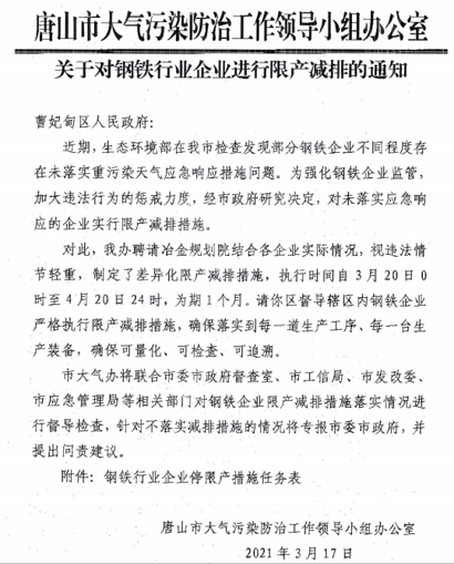 3月17日,唐山再度發(fā)布鋼企限產(chǎn)減排通知,針對近期生態(tài)環(huán)境部檢查中發(fā)現(xiàn)的不同問題加大懲戒力度,對未落實(shí)應(yīng)急響應(yīng)的企業(yè)實(shí)施限產(chǎn)措施,且制定了差異化限產(chǎn)減排措施,執(zhí)行時(shí)間自3月20日0時(shí)-4月20日24時(shí),為期1個(gè)月。此次唐山限產(chǎn)再出手,有助于加快去庫存,在碳達(dá)峰、碳中和目標(biāo)背景下,今年鋼鐵行業(yè)限產(chǎn)措施有望加嚴(yán)。