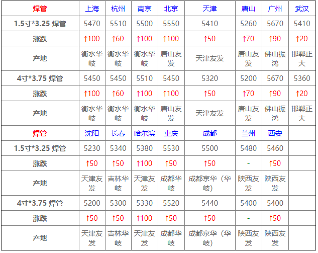 今日開市,29日唐山市場焊管價格窄幅上調,成交尚可。據富寶鋼鐵網管材研究中心市場監測顯示:成都市場1.5*3.25成都京華焊管價格為5740元/噸,4*3.75成都京華焊管價格為5730元/噸,6*4成都京華焊管價格為5780元/噸。