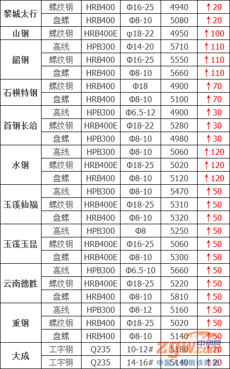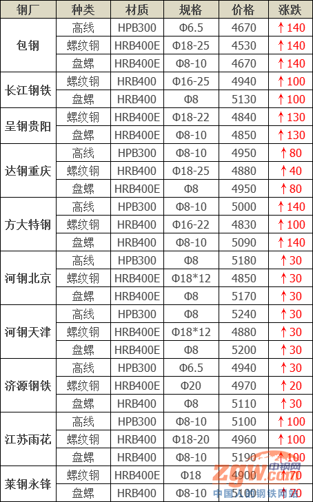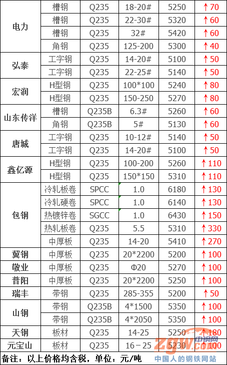 今日統計的39家鋼廠調價,漲幅最高為包鋼熱卷,調價幅度330元/噸,具體調價明細如下: