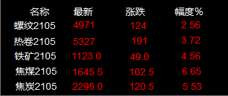 昨日黑色系商品期貨價格繼續大幅上漲。期螺上漲124收報4971,逼近5000關口,期卷上漲191收報5327,鐵礦石上漲49收報1123,焦煤上漲102.5收報1645.5,焦炭上漲120.5收報2298。唐山鋼坯昨日漲10元,今上午再漲10元,現報4790元/噸出廠。網優廢鋼統計29日3010,今早235跌。