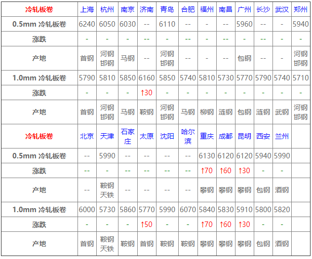 今全國冷軋市場漲跌穩(wěn)均現(xiàn),幅度30-140左右,市場部分規(guī)格存缺貨現(xiàn)象,商家為促進出貨,價格上實單有一定優(yōu)惠,整體成交一般;