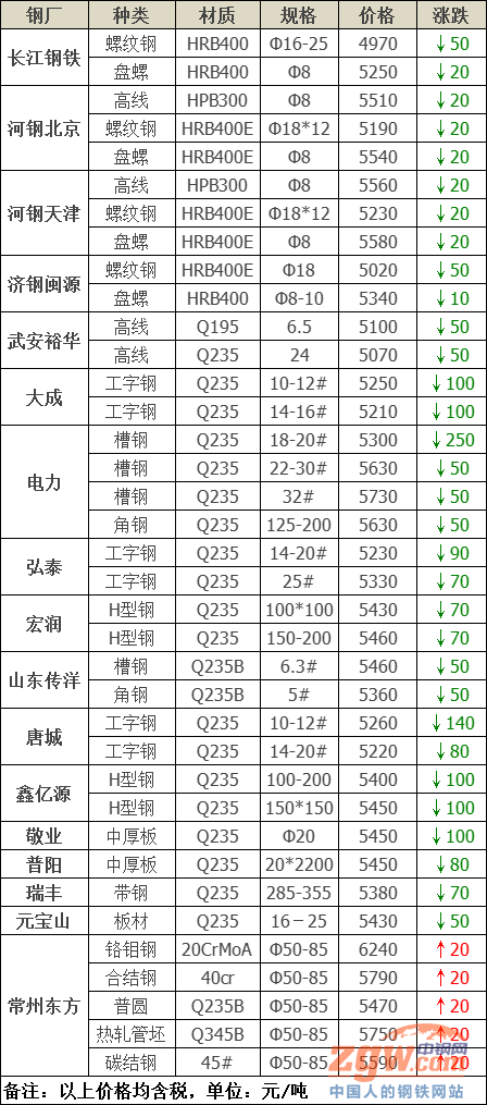 據數據監測,今日共22家鋼廠調價,其中漲幅最高為常州東方優鋼,調價幅度20元/噸,跌幅最大為電力槽鋼,調價幅度250元/噸,具體調價明細如下: 鋼廠調價 山西建邦建材價格平穩 江蘇雨花建材價格平穩 山西宏達建材價格平穩 石橫特鋼建材價格平穩 萊鋼永鋒建材價格平穩 濟鋼閩源建材價格平穩 山西高義建材價格平穩 武安裕華高線下調50元/噸 河鋼北京建材下調20元/噸 河鋼天津建材下調20元/噸 山東傳洋型材下調50元/噸 長江鋼鐵建材下調20-50元/噸 宏潤H型鋼下調70元/噸 大成工字鋼下調100元/噸 電力型材下調50-250元/噸 弘泰工字鋼下調70-110元/噸 唐城工字鋼下調80-140元/噸 鑫億源H型鋼下調100元/噸 敬業中厚板下調100元/噸 普陽中厚板下調80元/噸 元寶山板材下調50元/噸 瑞豐帶鋼下調70元/噸 常州東方優鋼上調20元/噸 鋼廠調價占比 上調1家,占比4.5%,調價幅度20元/噸。 下調14家,占比63.6%,調價幅度20-250元/噸。 平穩7家,占比31.9%。 重要行業信息 1、7家鋼鐵上市公司一季度凈利預增上限均翻倍 鋼鐵板塊指數近期連續拉升,多只鋼鐵股連續漲停。股價大幅拉升,一方面和鋼價連續推漲、需求維持高景氣度有關;另一方面,上市鋼企一季度業績表現不俗,截至4月9日晚,共有7家鋼鐵上市公司披露一季度業績預告,全都預喜,且凈利潤同比增長幅度上限均超過100%。 2、中鋼協:打好低碳綠色發展攻堅戰 中國鋼鐵工業協會發文稱,近期,國家發改委、工信部針對鋼鐵行業“控產能、減產量、回頭看”進行了部署。無論是控產能,還是減產量,都是國家經過全局平衡后做出的戰略抉擇,是新發展階段的新要求。全行業要進一步提高思想認識,積極貫徹落實國家決策部署:一、壓減產量要有保有壓,確保優勝劣汰。二、轉變自給自足的觀念,適應鋼鐵進出口新格局。三、打好低碳綠色發展攻堅戰,力爭“十四五”提前實現鋼鐵行業碳達峰。 3、中鋼協領導到防鋼基地調研:柳鋼集團要繼續發揮表率作用 4月8日,中國鋼鐵工業協會副會長駱鐵軍一行到柳鋼集團防城港鋼鐵基地(以下簡稱“防鋼基地”),實地調研了生產制造部智能制造中心、20萬噸碼頭、煉鐵1號高爐主控室。柳鋼集團黨委書記、董事長潘世慶,黨委副書記、副董事長、總經理甘貴平陪同調研,并就防鋼基地工程建設、工藝裝備、智能制造、環境保護等方面事宜與駱鐵軍一行進行座談交流。 4、警惕華爾街:國際大宗商品市場充滿“套路” 國際大宗商品價格從來都是“華爾街+美元”的權力,是華爾街金融財團利用美元霸權劫掠制造業國家的重要手段。歷史事實數次證明:大宗商品期貨價格暴漲暴跌的受益者是華爾街金融大佬,受害者則是中國等以實體經濟為本的國家及其制造企業。正因如此,中國必須高度警惕。