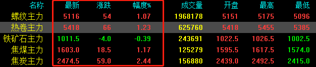 期鋼繼續(xù)收漲,期螺上漲54收報5116,期卷上漲66收報5418,鐵礦石下跌4收報1011.5,焦煤上漲18.5收報1603,焦炭上漲59收報2474.5。
