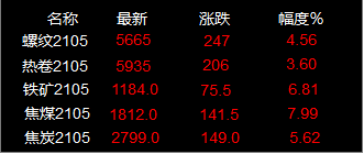 鋼材市場的瘋狂上漲勢頭還在持續。經過金三銀四的一漲再漲后,進入五月份,沙鋼、永鋼、中天等大鋼廠調漲出廠價格,唐山鋼坯站上5100大關,全國鋼價掀起新一輪漲價浪潮。受主導鋼廠節間大漲提振,昨日開市,黑色系全線大幅上揚。期螺上漲247收報5665,期卷上漲206收報5935,鐵礦石上漲75.5收報1184,焦煤上漲141.5收報1912,焦炭上漲149收報2799。唐山鋼坯昨日漲60元,今上午漲50元,現報5180元/噸出廠。網優廢鋼統計6日69漲0跌,今早60漲0跌。