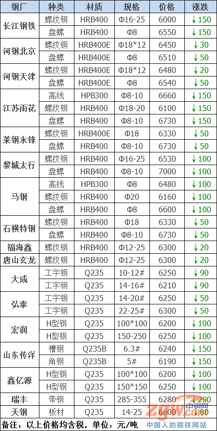 數據監測,今日共25家鋼廠調價,其中跌幅最高為瑞豐帶鋼,調價幅度200元/噸,具體調價明細如下: