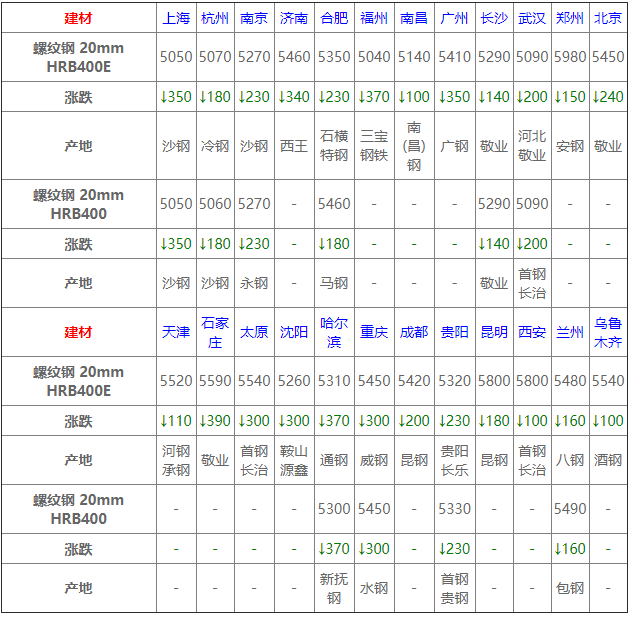 5 5月20日熱帶價格:下行為主; 今全國帶鋼主流下行,華北主導鋼廠降350-400,唐山窄帶降350-400不等,降后仍一般偏弱,僅個別低位可,華東華南弱勢下行; 6 5月20日型材價格:繼續走低; 今型價全面下調。坯料弱勢支撐,鋼廠指導價弱勢下調,利空情緒明顯,下游拿貨滯后,觀望氣息濃烈。短期型價繼續走低。