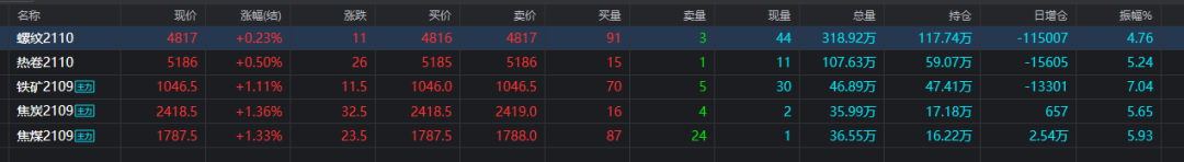期螺上漲11收報4817,期卷上漲26收報5186,鐵礦石上漲11.5收報1046.5,焦煤上漲23.5收報1787.5,焦炭上漲32.5收報2418.5。