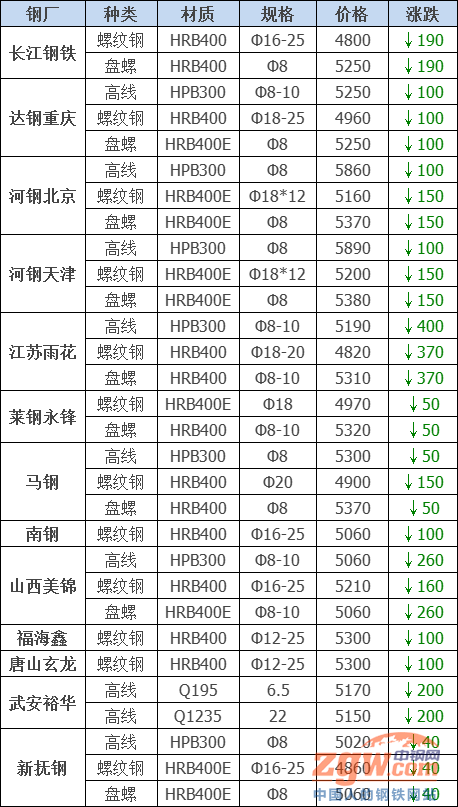 2021年5月27日鋼廠調價:調價:暴跌400!28家鋼廠最新調價!