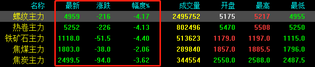 期鋼今日大跳水,期螺下跌216收?qǐng)?bào)4959,期卷下跌226收?qǐng)?bào)5252,鐵礦石下跌51.5收?qǐng)?bào)1118,焦煤下跌38收?qǐng)?bào)1803,焦炭下跌94收?qǐng)?bào)2499.5。
