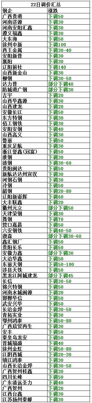 6月22日防城港廣鋼部分下調(diào)30:配重一類3990,配重2類3890,沖片一類3990,沖片二類4050,沖片三類4030,沖片四類4030,壓塊一類3990,壓塊二類3700,剪切一類3830,剪切二類3810,剪切三類3790,剪切四類3620,加工大料1類3300,加工大料2類3200。特優(yōu)精料2100,特級1260,含稅。