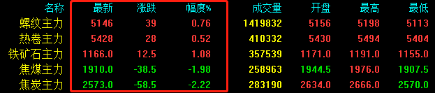 期螺上漲39收報5146,期卷上漲28收報5428,鐵礦石上漲12.5收報1166,焦煤下跌38.5收報1910,焦炭下跌58.5收報2573。