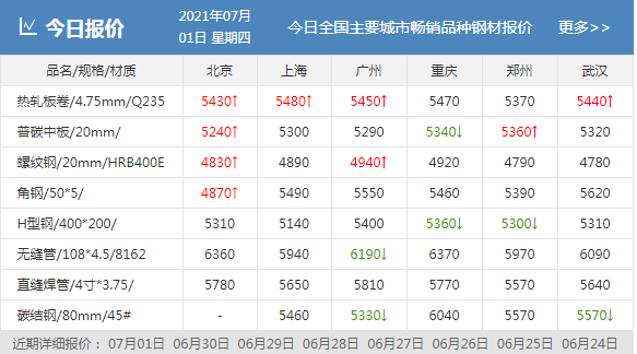 伴隨“七一”建黨百年慶典,鋼市下半年行情正式開啟。期鋼早盤一路上漲,帶動現貨看漲情緒推升,商家報價紛紛上調,但午后漲勢明顯放緩,上漲依舊乏力。
