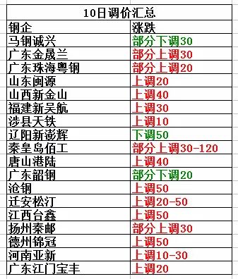 7月10日河南亞新上調10-30:鋼板10厚以上3740,6厚以上3690,特級16厚以上3700,重A10厚以上3610,重B6厚以上3520,中型4厚3370,機生鐵3450,鋼筋壓塊3640,清一色大車前后橋3590,鋼筋切頭3780,沖子、沖豆3760,不含稅。