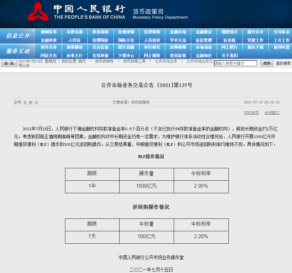 今日央行下調金融機構存款備金率0.5個百分點(不含已執行5%存款準備金率的金融機構),釋放長期資金約1萬億元。同時,開展1000億元中期借貸便利(MLF)操作和100億元逆回購操作。因今日有4000億元MLF到期,凈投放約有7000萬。市場流動性相對寬裕,有助于對沖7月下旬稅期高峰等影響,宏觀利好持續。