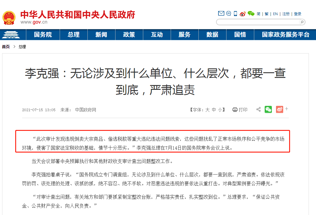 7月14日國常會對中央預算執行和其他財政收支審計查出問題的整改工作進行部署,并強調“審計發現違規倒賣大宗商品、偷逃稅款等重大違紀違法問題線索,這些問題擾亂了正常市場秩序和公平競爭的市場環境,侵害了國家法定稅收的基礎。國務院成立專門調查組,無論涉及到什么單位、什么層次,都要一查到底,嚴肅追責?!眹衲甓啻吸c名大宗商品,意味政策層面來看,價格上行仍面臨壓力。