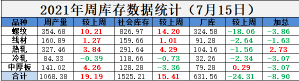 在連續5周累庫之后,本周迎來淡季首次降庫9萬噸,從具體數據來看,社會庫存仍增加15.41萬噸,鋼廠庫存較上周下降24.31萬噸,說明7月中旬,鋼廠訂單量增加是導致此輪降庫的主要原因。此外,從表觀需求來看,本周增加40萬噸,螺紋鋼消費量增加25萬噸,一定程度上緩解了淡季累庫壓力,對鋼價形成支撐。