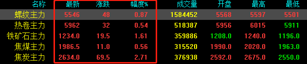 今日期鋼漲幅有限,期螺上漲48收報5546,期卷上漲32收報5962,鐵礦石上漲19.5收報1234,焦煤上漲11收報1986.5,焦炭上漲69.5收報2634。