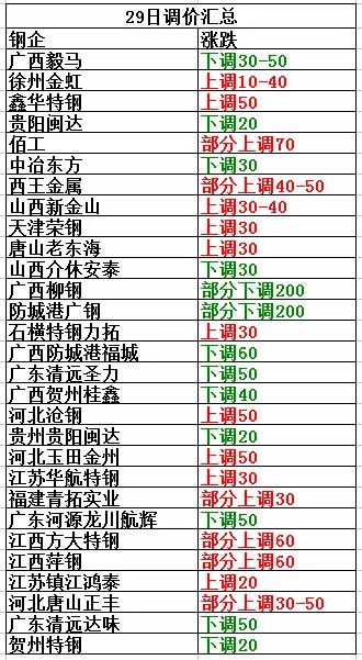 7月29日防城港廣鋼部分下調200:配重一類3740,配重2類3640,沖片一類3690,沖片二類3750,沖片三類3730,沖片四類3730,壓塊一類3740,壓塊二類3500,剪切一類3630,剪切二類3610,剪切三類3590,剪切四類3420,加工大料1類3000,加工大料2類2900,特優精料2130,特級1260,含稅。