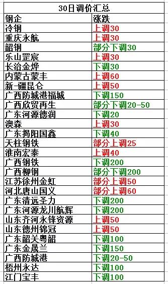 7月30日廣東金晟蘭下調(diào)30-100:鋼筋切粒/沖子3610,純鋼筋頭3560,鋼筋壓塊3520,清一色邊角料3610,重廢一3520-3570,重廢二3500,中廢3370-3420,清一色汽車(chē)料(08鋁)3530-3580,鋼刨花/數(shù)控、普通刨花碎屑暫停收,不含稅。