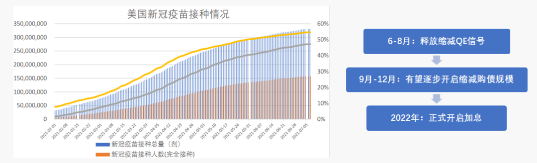 同時(shí),值得關(guān)注的是,今年全球大宗商品價(jià)格上漲離不開通脹推動(dòng),美國勞動(dòng)部數(shù)據(jù)顯示,6月CPI同比5.4%,創(chuàng)2008年8月以來新高,且核心CPI同比4.5%,為1991年9月以來新高,通脹壓力不斷推升,加大市場對(duì)貨幣政策調(diào)整的預(yù)期。但從美國目前的就業(yè)情況來看,雖有所改善,但仍未恢復(fù)到疫情前水平。短期美聯(lián)儲(chǔ)貨幣政策難有快速轉(zhuǎn)向。且近期美聯(lián)儲(chǔ)議息會(huì)議中強(qiáng)調(diào)不急于調(diào)整政策,根據(jù)此前美聯(lián)儲(chǔ)官員表態(tài),美國新冠疫苗接種達(dá)75%時(shí)考慮縮減購債規(guī)模,目前接種率不到60%,預(yù)計(jì)達(dá)到該標(biāo)準(zhǔn)有望在9月至10月,因此,預(yù)計(jì)美聯(lián)儲(chǔ)貨幣政策收緊最早有望在10月左右進(jìn)行,最晚也可能到11月至12月開始。短期來看,8月大宗商品仍將維持高位,但需要關(guān)注8月19日美聯(lián)儲(chǔ)議息會(huì)議是否釋放收緊信號(hào)。