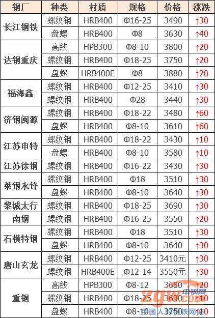 今日鋼廠出廠價格反彈明顯,鋼坯止跌回漲,提振市場信心,廠家挺價意愿強,商家出貨積極,預計節后鋼廠價格偏強運行。據中鋼網(微信公眾號:中鋼網)數據監測,今日共34家鋼廠調價,其中最高漲幅為濟鋼閩源建材,調價幅度60元/噸,具體調價明細如下: