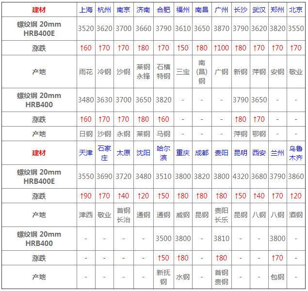 今日建材價格大漲60-80元/噸。國際原油需求復(fù)蘇,提振大宗商品,黑色系高位反彈,疊加鋼原料鋼材需求良好,鋼坯大幅拉漲,現(xiàn)貨跟漲意愿明顯,現(xiàn)貨資源交投氛圍活躍。綜合考慮,預(yù)計短期內(nèi)建材價格繼續(xù)上漲。