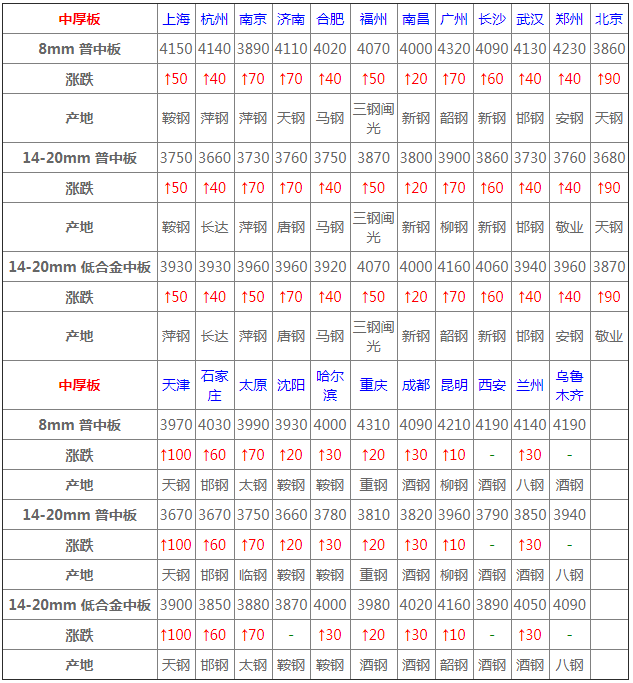 今日中板市場價格偏強拉漲,漲后市場氛圍一般,外圍利好因素眾多,成本端百元左右支撐,期鋼翻紅帶動,國內(nèi)兩會在即,形式一片大好,下游存恐高心理,需求不及預(yù)期,但是就目前而言利多大于利空,因此料短期價格或趨強運行。