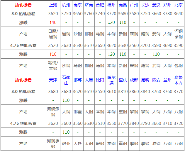 5月27日熱軋板卷價(jià)格:偏弱10-20元/噸; 今熱卷價(jià)格穩(wěn)中偏強(qiáng),主流規(guī)格價(jià)格在3520-3530元/噸。從市場(chǎng)了解的情況看,早盤期卷震蕩翻紅,現(xiàn)貨市場(chǎng)心態(tài)堅(jiān)挺,普后資源報(bào)價(jià)略有上調(diào),但終端采買積極性不高,高位成交清淡。綜合考慮,目前市場(chǎng)供需弱平衡,價(jià)格波動(dòng)幅度有限,故預(yù)計(jì)短期內(nèi)熱卷主流價(jià)格或窄幅震蕩。