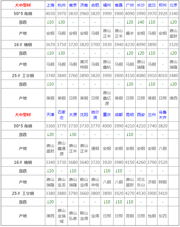 5 5月27日熱帶價(jià)格:窄幅弱調(diào)10-30元/噸; 今熱帶價(jià)格穩(wěn)中偏弱,目前受華北行情影響,商家報(bào)價(jià)盤中有讓利。宏觀方面,海關(guān)總署公布數(shù)據(jù)顯示,2020年4月,我國(guó)出口鋼鐵板材407萬噸,同比增長(zhǎng)5.1%;1-4月累計(jì)出口1291萬噸,同比下降8.2%。內(nèi)需有下滑態(tài)勢(shì),外需依舊不足。綜合來看,預(yù)計(jì)短期內(nèi)熱帶市場(chǎng)或偏弱調(diào)整運(yùn)行。 6 5月27日型材價(jià)格:偏弱整理10-20元/噸; 今型價(jià)弱勢(shì)下調(diào)。需求釋放無力,市場(chǎng)資源上行動(dòng)力不足,中間商觀望心理明顯,成交氛圍暫無改善,短期型價(jià)將穩(wěn)中趨弱整理。
