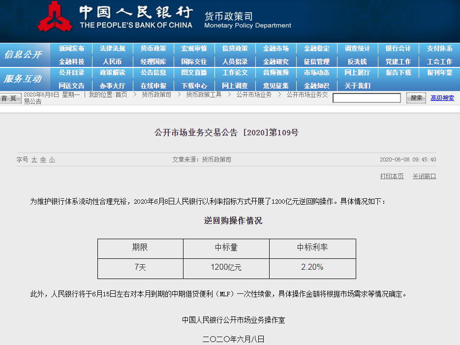 本周一有5000億元MLF到期,周四有700億元逆回購到期,周五有1500億元逆回購到期。共計7200億元巨量資金到期,為緩解市場流動性壓力,央行今日開展1200億元逆回購操作,此外,人民銀行將于6月15日左右對本月到期的中期借貸便利(MLF)一次性續做,關注利率變動。