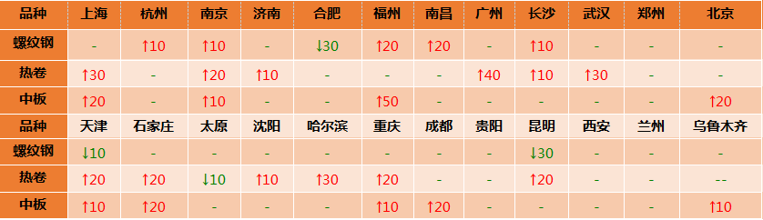 受巴西淡水河谷礦區停產消息影響,今日早盤鐵礦石期貨迅速拉漲超6%,帶動黑色系普漲,現貨價格上調,市場成交略有好轉,部分商家看漲積極采購,但漲幅有限,華南、華東暴雨仍在持續。