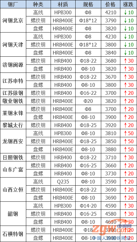 統計的35家鋼廠調價中,漲幅最高為瑞豐帶鋼,調價幅度40元/噸,跌幅最大為山東傳洋型材,調價幅度20元/噸,具體調價明細如下: