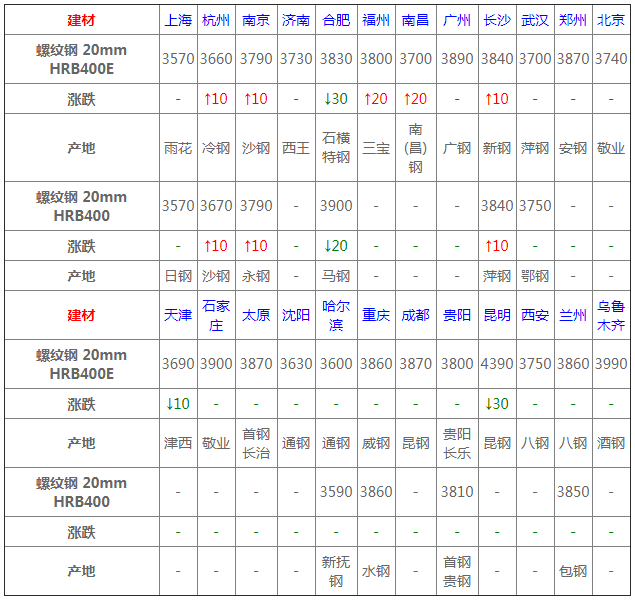 螺紋鋼24個市場中5個市場上漲10-20,2個市場下跌10-30,20mmHRB400E平均價格3805元/噸,較上個交易日價格相同;