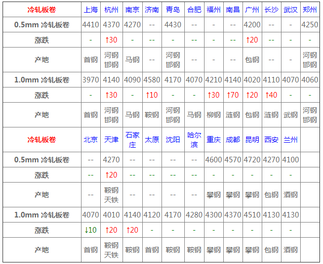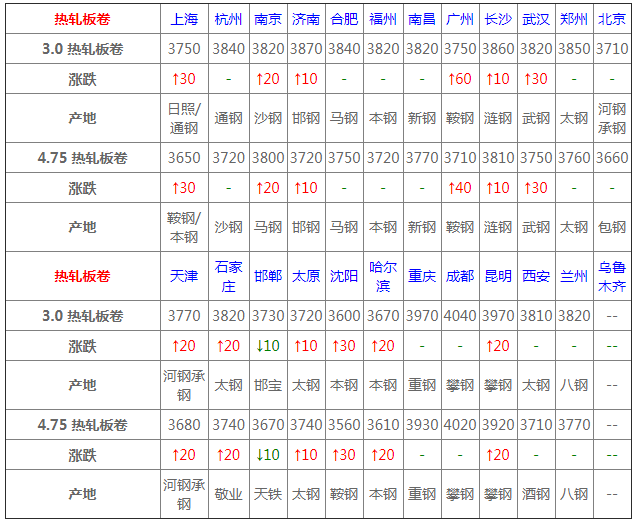熱卷24個市場中12個市場上漲10-30,1個市場下跌10,4.75熱軋板卷平均價格3747元/噸,較上個交易日上調11元/噸;