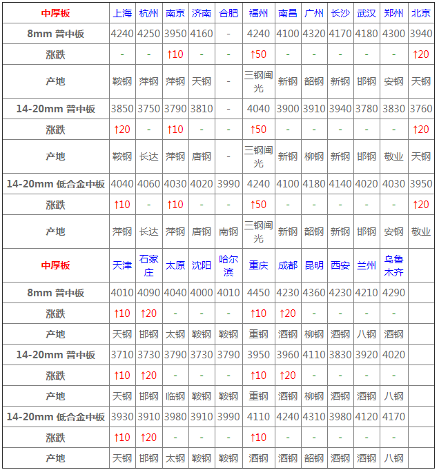 中板24個市場中8個市場上漲10-50,14-20mm普中板平均價格3859元/噸,較上個交易日上調9元/噸。