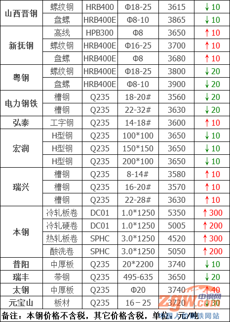 今日統(tǒng)計的31家鋼廠調(diào)價中,漲幅最高為本鋼板材,調(diào)價幅度300元/噸,跌幅最大為南鋼螺紋鋼,調(diào)價幅度40元/噸,具體調(diào)價明細如下:
