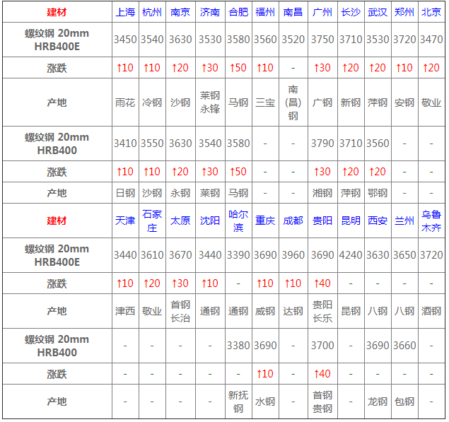 今日華東地區建材成交好于華北地區,商家挺價意愿較強,市場整體成交良好,各地報價普遍上調: